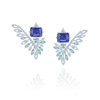 Octagon-cut tanzanites. Marquis and trillion cut aquamarines. Marquis, trillion and round cut diamonds.