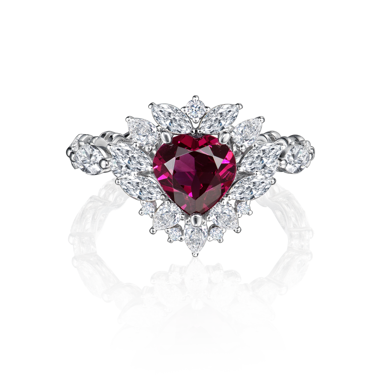 Rhodolite cut heart. Pear-cut, marquise and round-cut diamonds.