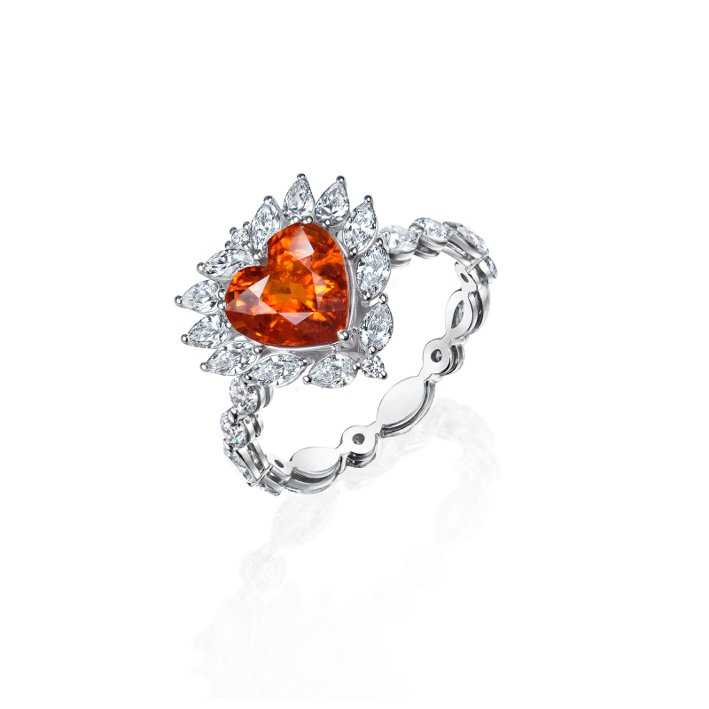 Garnet Spessartin cut heart. Pear-cut, marquise and round-cut diamonds.