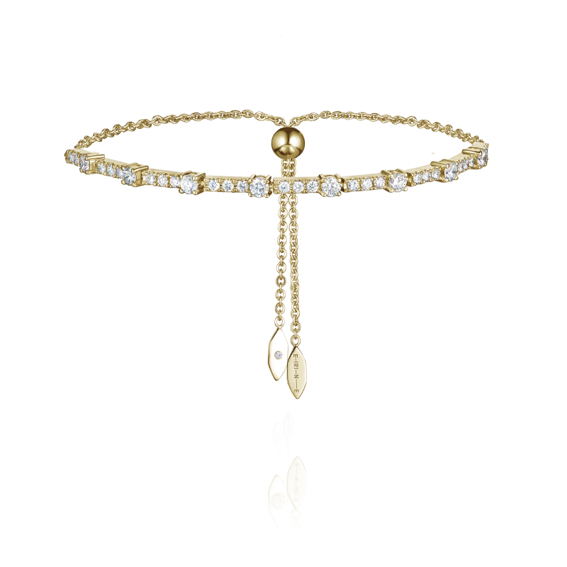 A classic yellow gold bracelet with a trail of sparkling diamonds and an original bolo clasp. The length of the bracelet is adjusted thanks to a long-lasting attachment in the shape of a ball and will fit any wrist diameter.