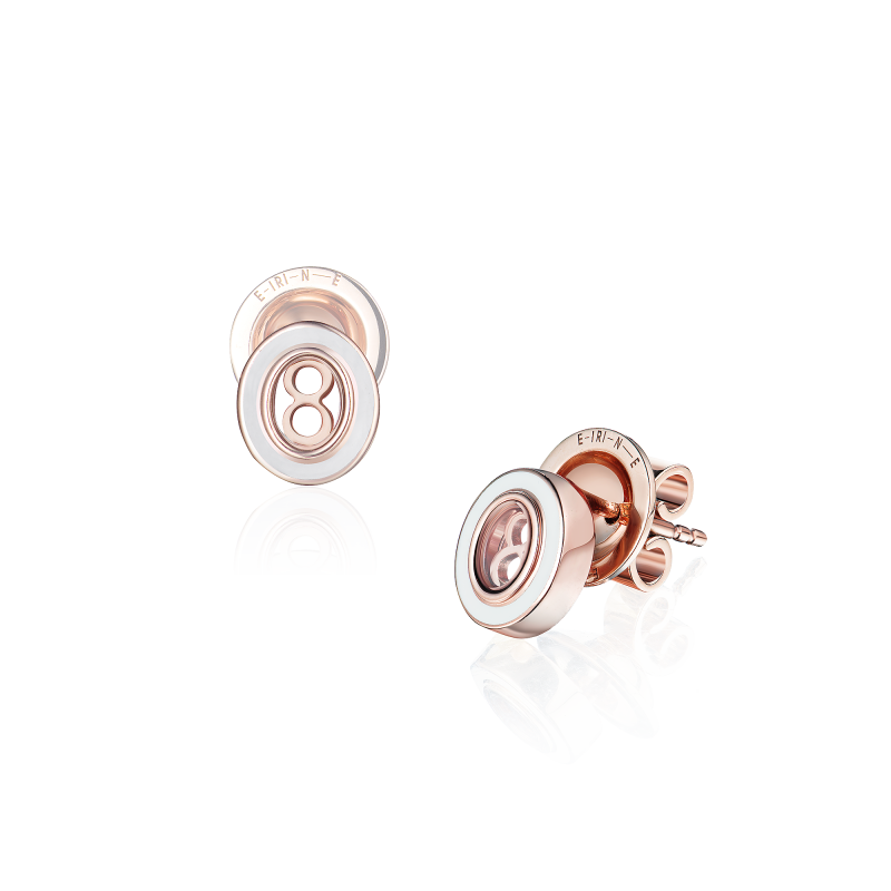 Oval-shaped conceptual stud earrings made of rose gold. The gold number in the center is protected by sapphire crystal and decorated with a rim of colored enamel. The figure can act as a mascot. It is easy to match a ring and a necklace of the same design to the stud earrings and get the perfect set of jewelry.