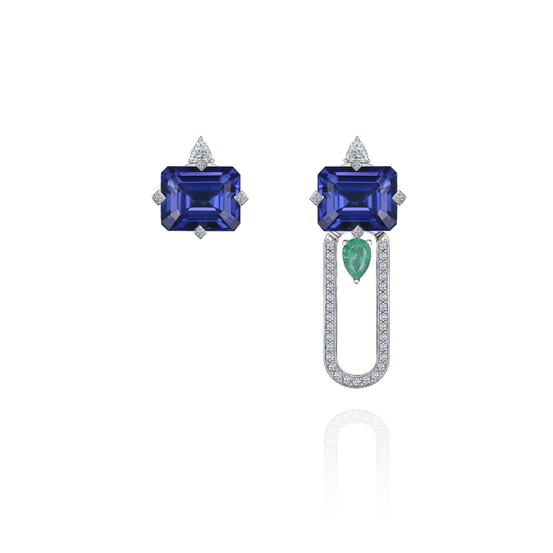 Stud earring with tanzanite, emerald and diamonds