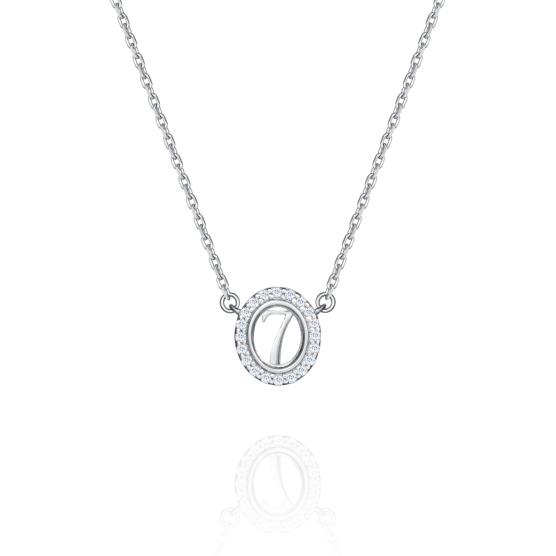 Elegant pendant on a chain with three levels of length in white gold. The gold number in the center of the pendant is securely hidden by sapphire crystal and framed by a shining diamond scattering. The role of the figure here is conditional and ambiguous. It can be a password, a signal, or a symbol, the essence and meaning of which are known only to you.