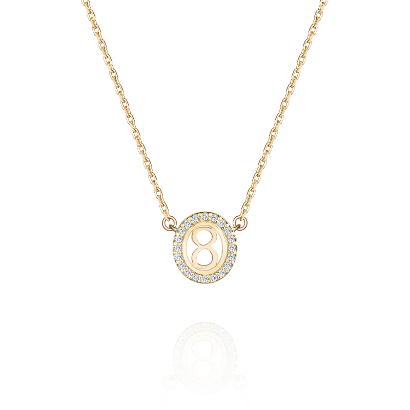 Elegant pendant on a chain with three levels of length in yellow gold. The gold number in the center of the pendant is securely hidden by sapphire crystal and framed by a shining diamond scattering. The role of the figure here is conditional and ambiguous. It can be a password, a signal, or a symbol, the essence and meaning of which are known only to you.