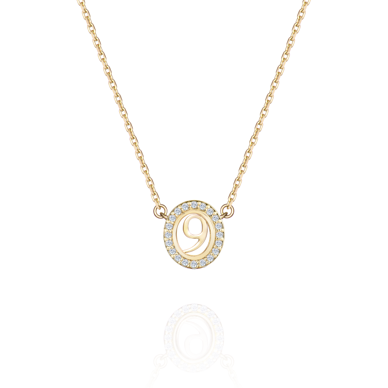 Elegant pendant on a chain with three levels of length in yellow gold. The gold number in the center of the pendant is securely hidden by sapphire crystal and framed by a shining diamond scattering. The role of the figure here is conditional and ambiguous. It can be a password, a signal, or a symbol, the essence and meaning of which are known only to you.