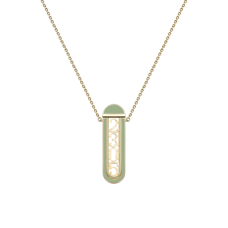 The capsule is made of yellow gold and sapphire crystal, framed by a gold rim with colored enamel, attached to a chain with three levels of length. You can simultaneously put 4 interchangeable gold numbers in the capsule, which serve as a symbol of something important and special. These may be dates associated with certain events or traditions of your family, with circumstances that have changed the course of your life. The set includes branded tweezers and 10 gold digits from 0 to 9, which can be easily changed independently in the capsule.