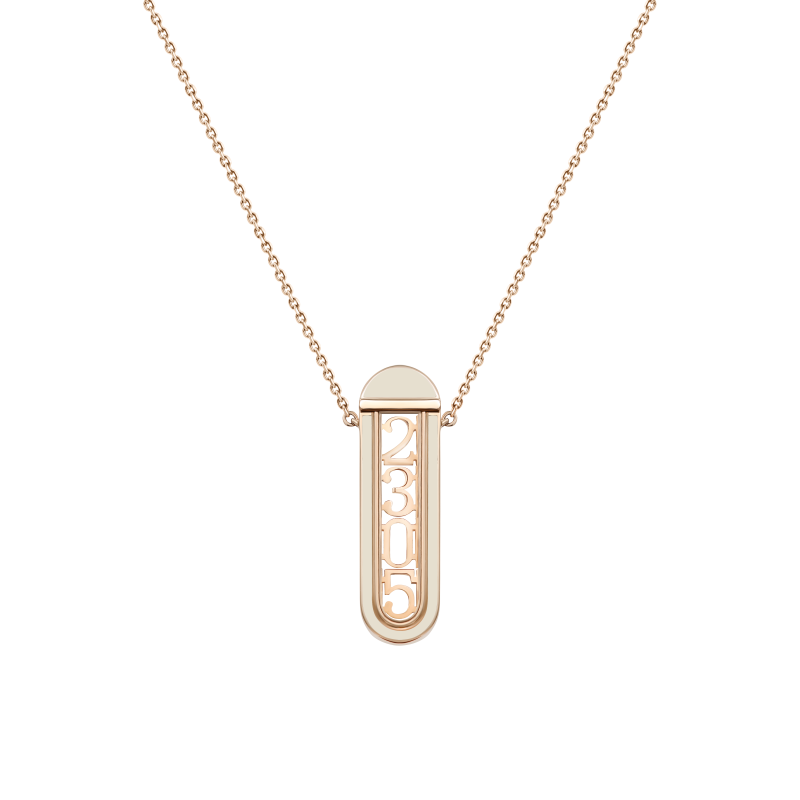 The capsule is made of rose gold and sapphire crystal, framed by a gold rim with colored enamel, attached to a chain with three levels of length. You can simultaneously put 4 interchangeable gold numbers in the capsule, which serve as a symbol of something important and special. These may be dates associated with certain events or traditions of your family, with circumstances that have changed the course of your life. The set includes branded tweezers and 10 gold digits from 0 to 9, which can be easily changed independently in the capsule.