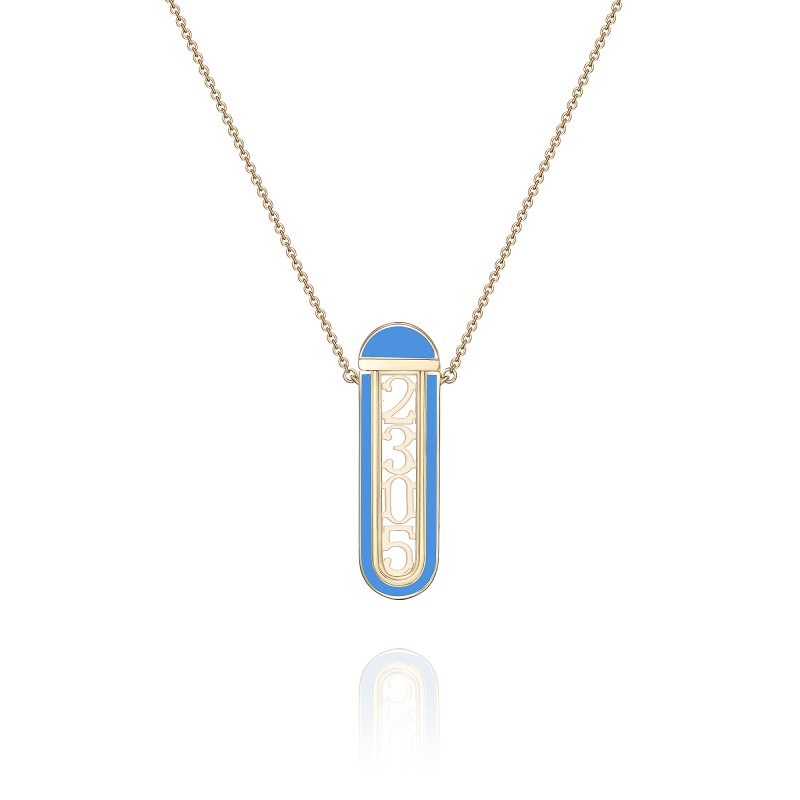The capsule is made of yellow gold and sapphire crystal, framed by a gold rim with colored enamel, attached to a chain with three levels of length. You can simultaneously put 4 interchangeable gold numbers in the capsule, which serve as a symbol of something important and special. These may be dates associated with certain events or traditions of your family, with circumstances that have changed the course of your life. The set includes branded tweezers and 10 gold digits from 0 to 9, which can be easily changed independently in the capsule.