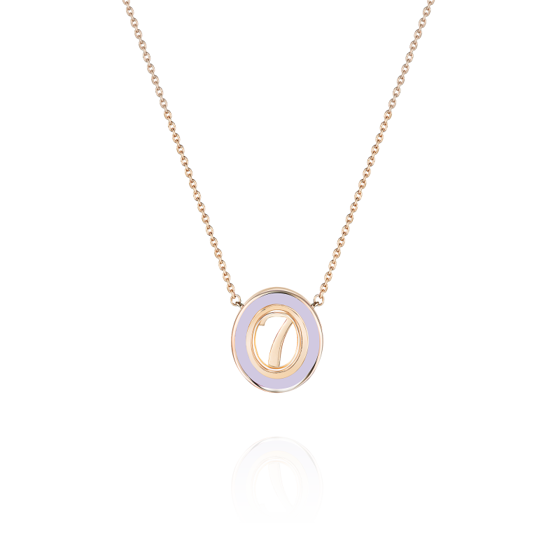 The conceptual pendant on a chain with three levels of length is made of rose gold. In the center of the pendant, under a sapphire crystal with a rim of colored enamel, there is a gold numeral. The meaning and meaning of the number may not be available to outsiders, but it is extremely important to you.