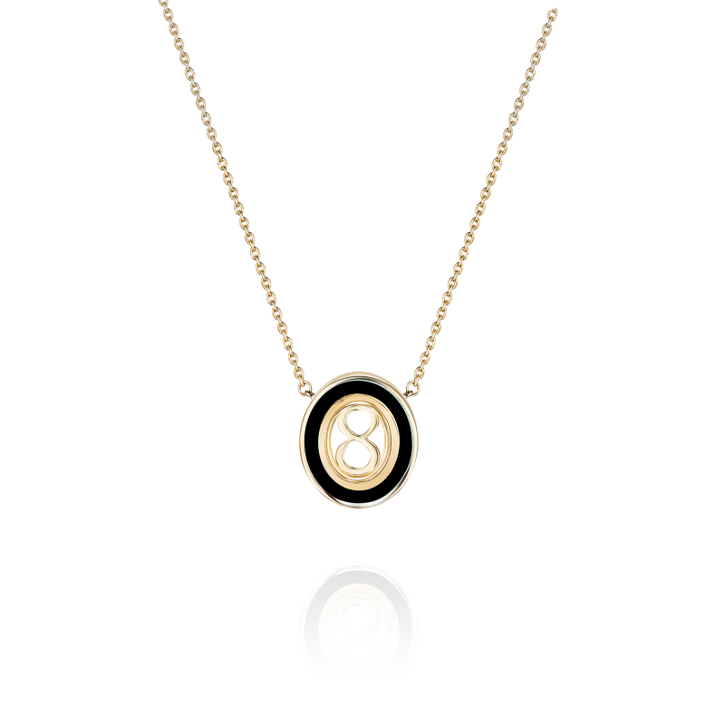 The conceptual pendant on a chain with three levels of length is made of yellow gold. In the center of the pendant, under a sapphire crystal with a rim of colored enamel, there is a gold numeral. The meaning and meaning of the number may not be available to outsiders, but it is extremely important to you.