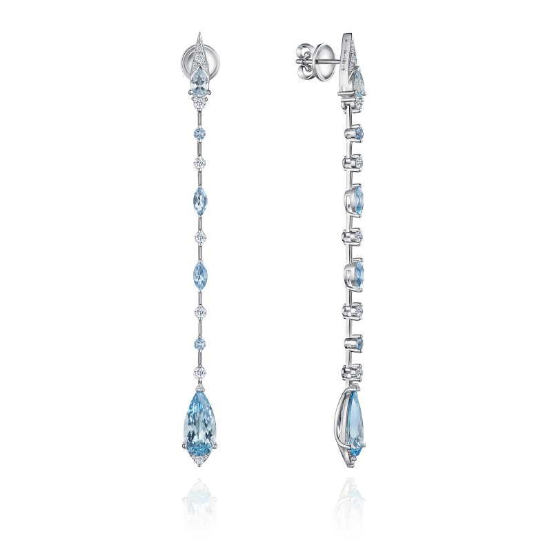 Aquamarines of pear, marquise and round cut. Round-cut diamonds.