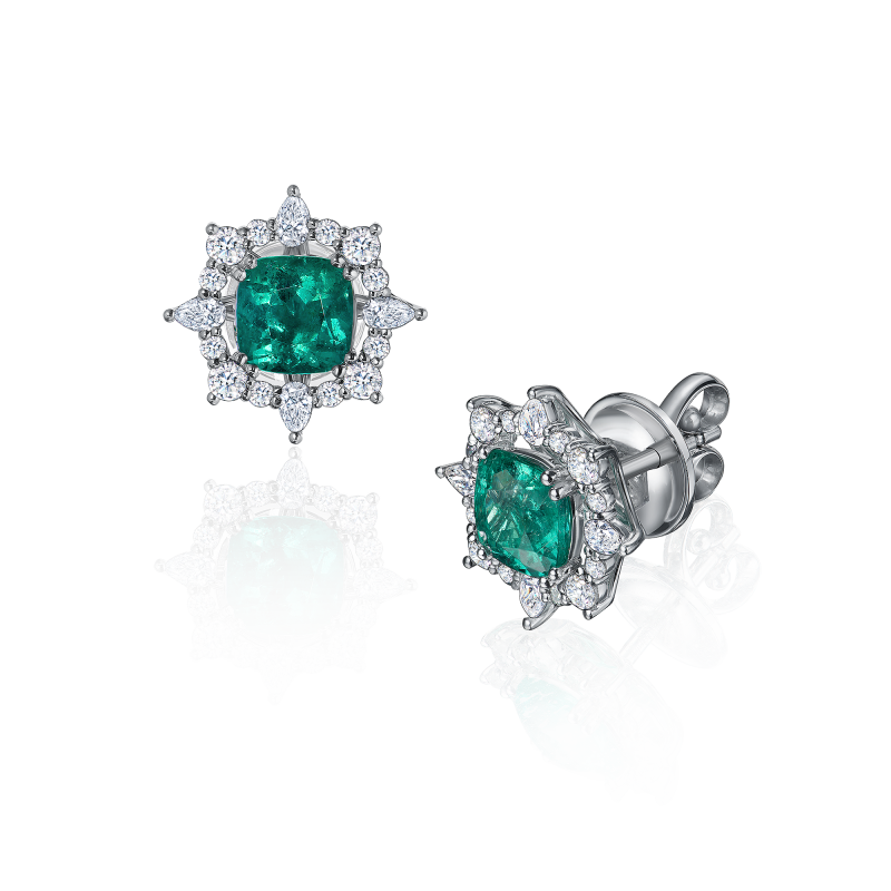 Emeralds of antique cut. Pear-cut and round-cut diamonds.
