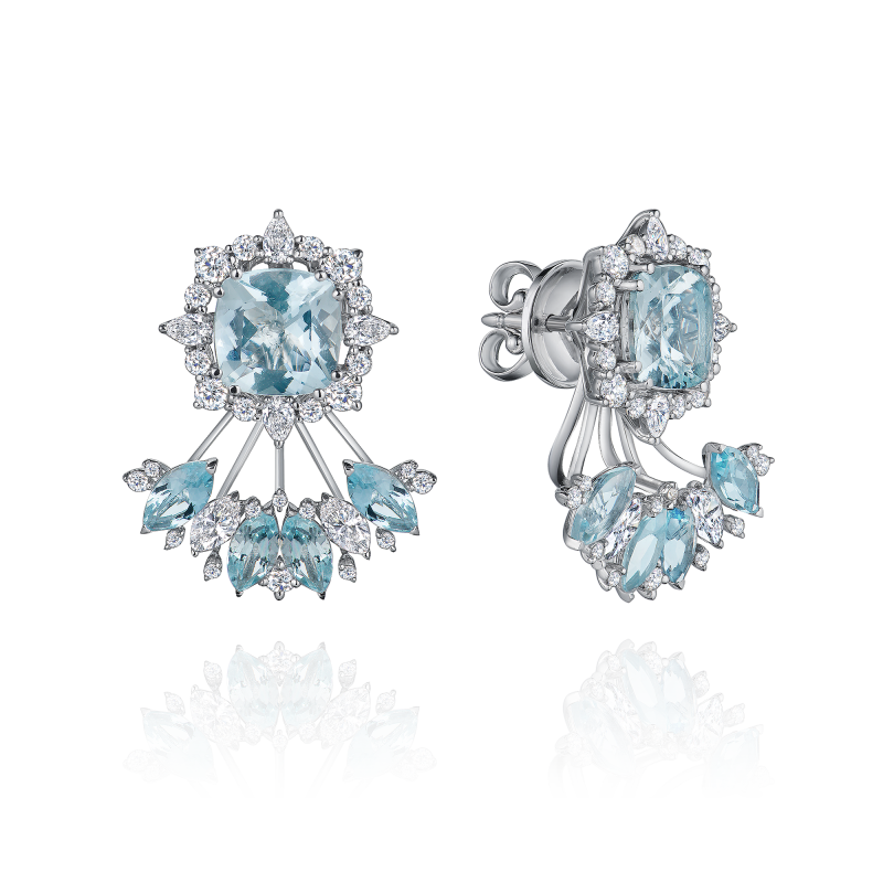 Antique and marquise cut aquamarines. Pear-cut, marquise and round-cut diamonds.