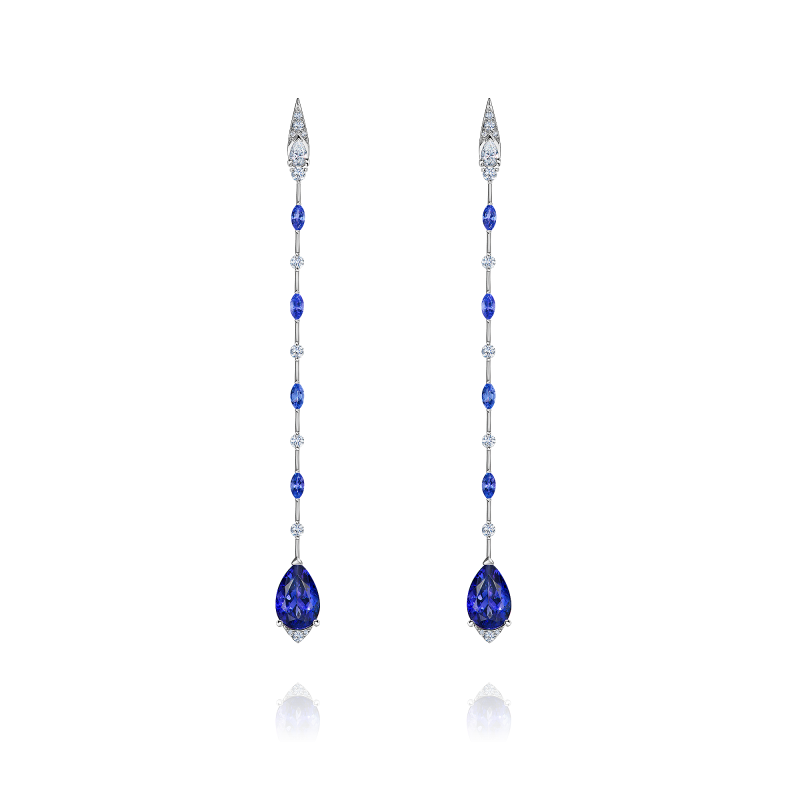 Tanzanites pear-cut and marquis-cut. Pear-cut and round-cut diamonds.