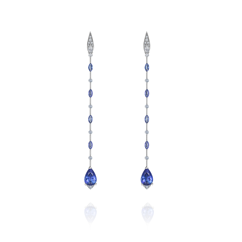 Tanzanites pear-cut and marquis-cut. Pear-cut and round-cut diamonds.