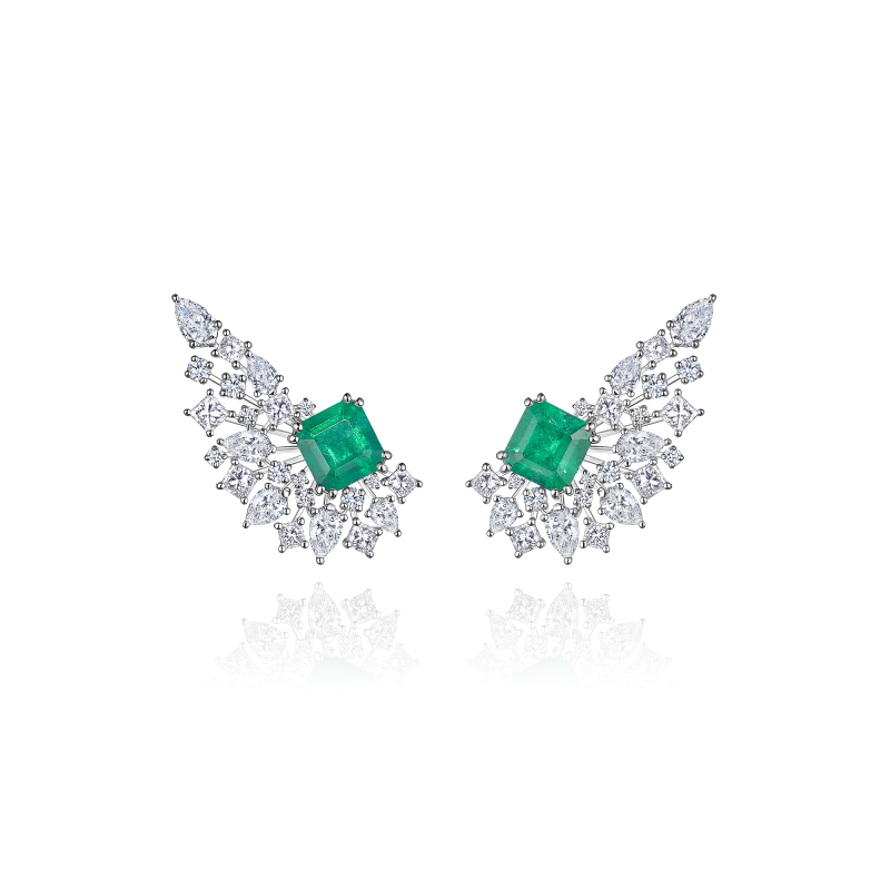 Emeralds of emerald cut. Pear-cut, princess-cut and round-cut diamonds.