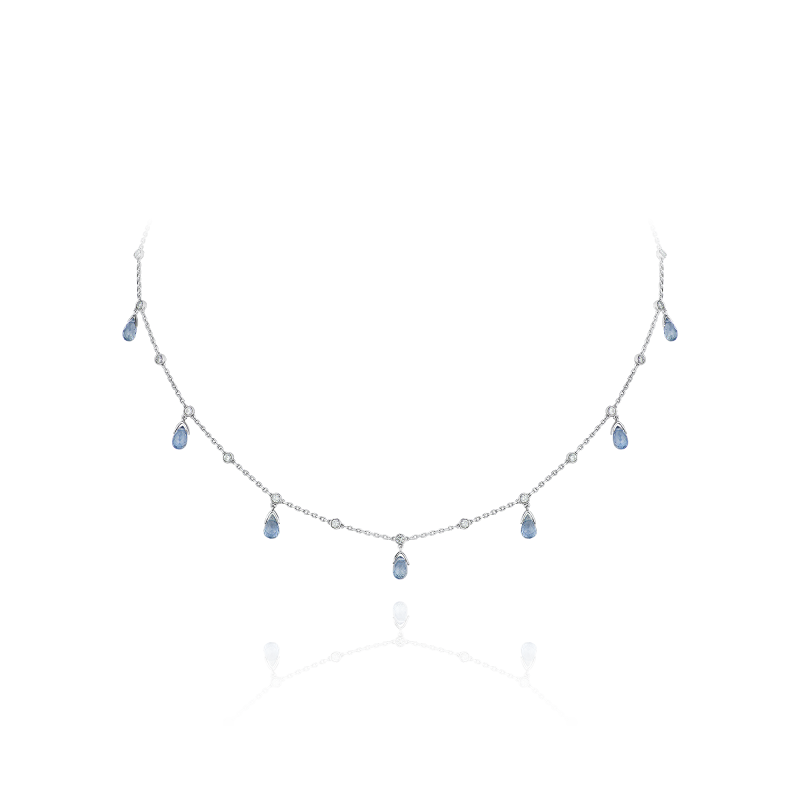 A blue briolette-cut sapphires. Round-cut diamonds.