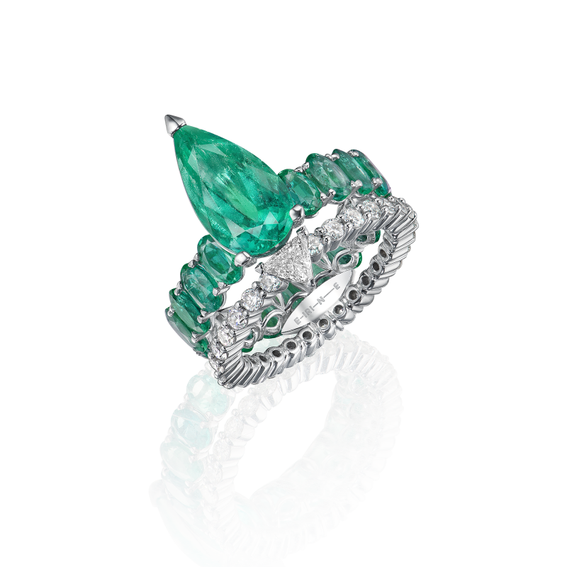 The emeralds are cut pear and oval. Trillion-cut and round-cut diamonds.