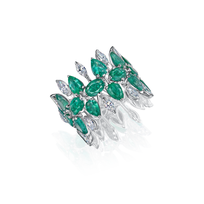 The emeralds are cut pear and oval. Marquis cut diamonds.