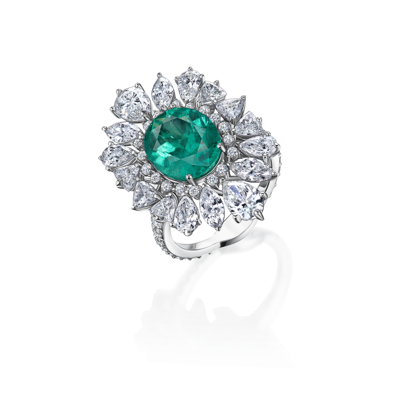 An oval-cut emerald. Pear, trillion, marquise and round-cut diamonds.