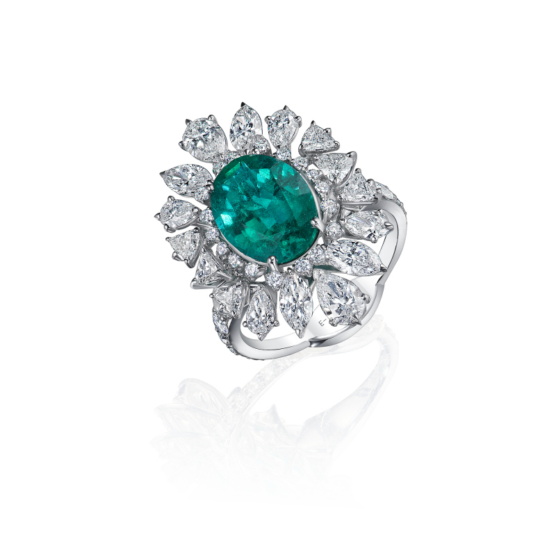 An oval-cut emerald. Pear, trillion, marquise and round-cut diamonds.