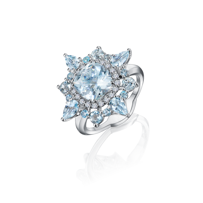Antique, pear and round-cut aquamarines. Round-cut diamonds.