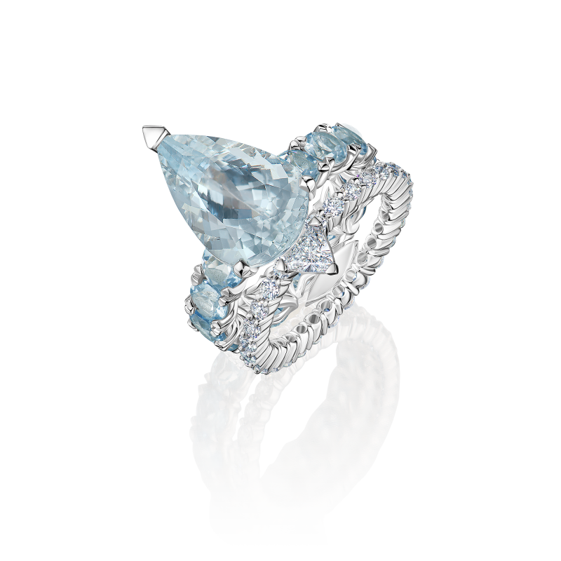 Pear-cut and round-cut aquamarines. Trillion-cut and round-cut diamonds.