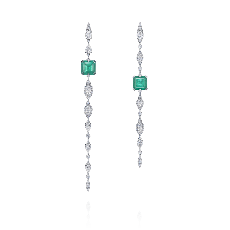 Emeralds of emerald cut. Pear-cut and round-cut diamonds.